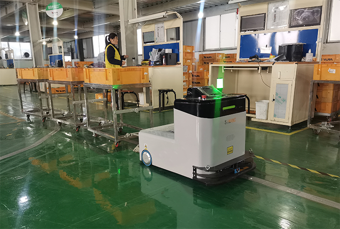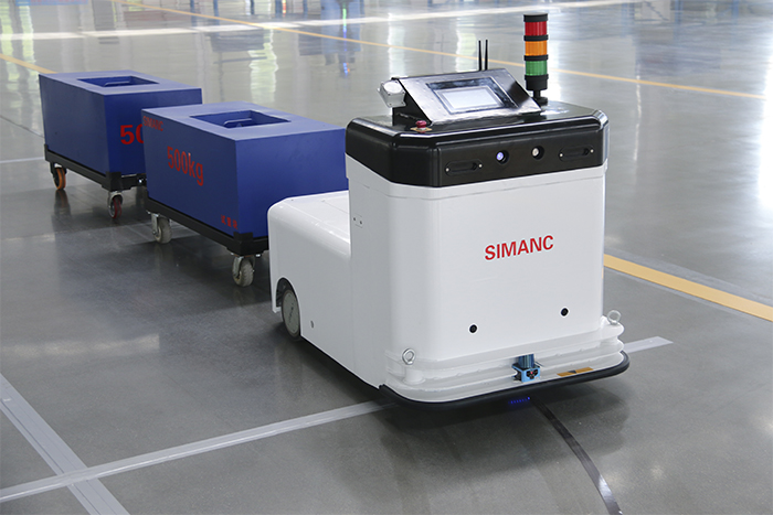 该企业原有的生产现场,各工序间需要配备多名转运人员,不间断地进行物料配送。不仅人员投入量大,且存在着响应不及时、管理复杂等痛点。西曼克技术团队深入调研后,为其量身打造了牵引式搬运机器人解决方案。一台AGV即可负责完整工序段的转运任务,通过柔性牵引多台物料车,实现了“原料精准配送、半成品有序流转”的智能化循环。